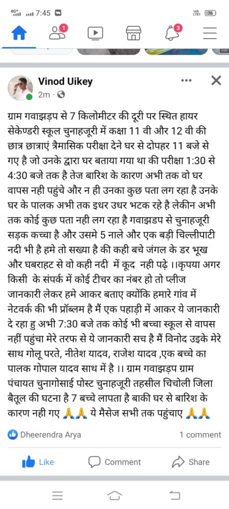 Betul Me Bacche lapata: बैतूल। चिचोली ब्लॉक के गवाझडप गांव के 7 छात्र- छात्राएं चूनाहजूरी में पेपर देने के बाद शाम तक घर नहीं पहुंच पाए। छात्र- छात्राओं के घर नहीं पहुंचने के बाद परिजनों का बुरा हाल हो गया है। आशंकाओं के बीच सभी छात्राओं के परिजनों ने रिश्तेदारों एवं को सूचना दी हैं। रात 9 बजे तक किसी का भी पता नहीं चल पाया है।