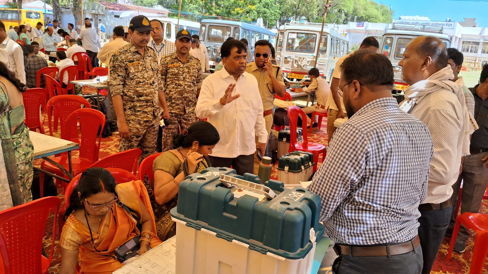 बैतूल विधानसभा के लिए मतदान दलों को जेएच कालेज से चुनावा सामग्री देकर रवाना किया गया। इसके अलावा मुलताई विस के लिए केंद्रीय विद्यालय, आमला में अंबेडकर कालेज, शाहपुर में एक्सीलेंस स्कूल, भैंसदेही में कन्या स्कूल से मतदान दल सामग्री लेकर रवाना हुआ। मतदान दल के साथ सुरक्षाकर्मी भी बसों में मतदान स्थल के लिए रवाना हुए हैं। कड़ी सुरक्षा के बीच कल मंगलवार सुबह 7 बजे से मतदान शुरू कर दिया जाएगा जो शाम 6 बजे तक चलेगा। जिले में मतदान की प्रक्रिया शांतिपूर्ण तरीके से सम्पन्न हो सके इसके लिए चप्पे-चप्पे पर सुरक्षाकर्मी तैनात किए गए हैं। जिले के अलावा बाहर से भी पुलिस बल बैतूल बुलवाया गया है।