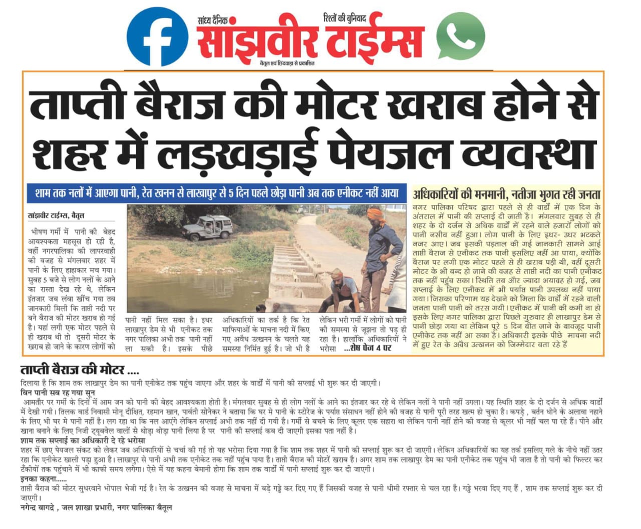 बैतूल। शहर में पानी सप्लाई की व्यवस्था बनाने वाले नगरपालिका के जलशाखा के ईमानदार और वरिष्ठ सब इंजीनियर नगेन्द्र वागद्रे की बदइंतजाम कार्यप्रणाली का ही नतीजा है कि मंगलवार को शहर के कई वार्डों में पानी सप्लाई नहीं हुई। कहा जाता है कि सब इंजीनियर वरिष्ठ होने के कारण तजुर्बेकार है, लेकिन बैराज की एक मोटर पहले से खराब होने पर समय के पहले मरम्मत नहीं कराना उनकी गली की हड्डी बन गया, दूसरी मोटर ने साथ छोड़ा तो शहर की पेयजल व्यवस्था ठप हो गई।