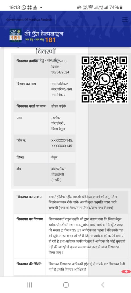 इस संदर्भ में जब सहायक 3 कर्मचारी अंकुर तेलकर से फोन पर संपर्क किया गया तो उन्होंने कहा कि सीएमओ साहब का दबाव रहता है। इसलिए सिर्फ एक ही झूठी शिकायत की थी। वही नगर परिषद के बिजली शाखा के कर्मचारी राहुल द्वारा स्ट्रीट लाइट खराब होने की शिकायत सीएम हेल्पलाइन में दर्ज कराई गई और बाद में स्ट्रीट लाइट का सुधार कर से हेल्पलाइन बंद कर ली गई।