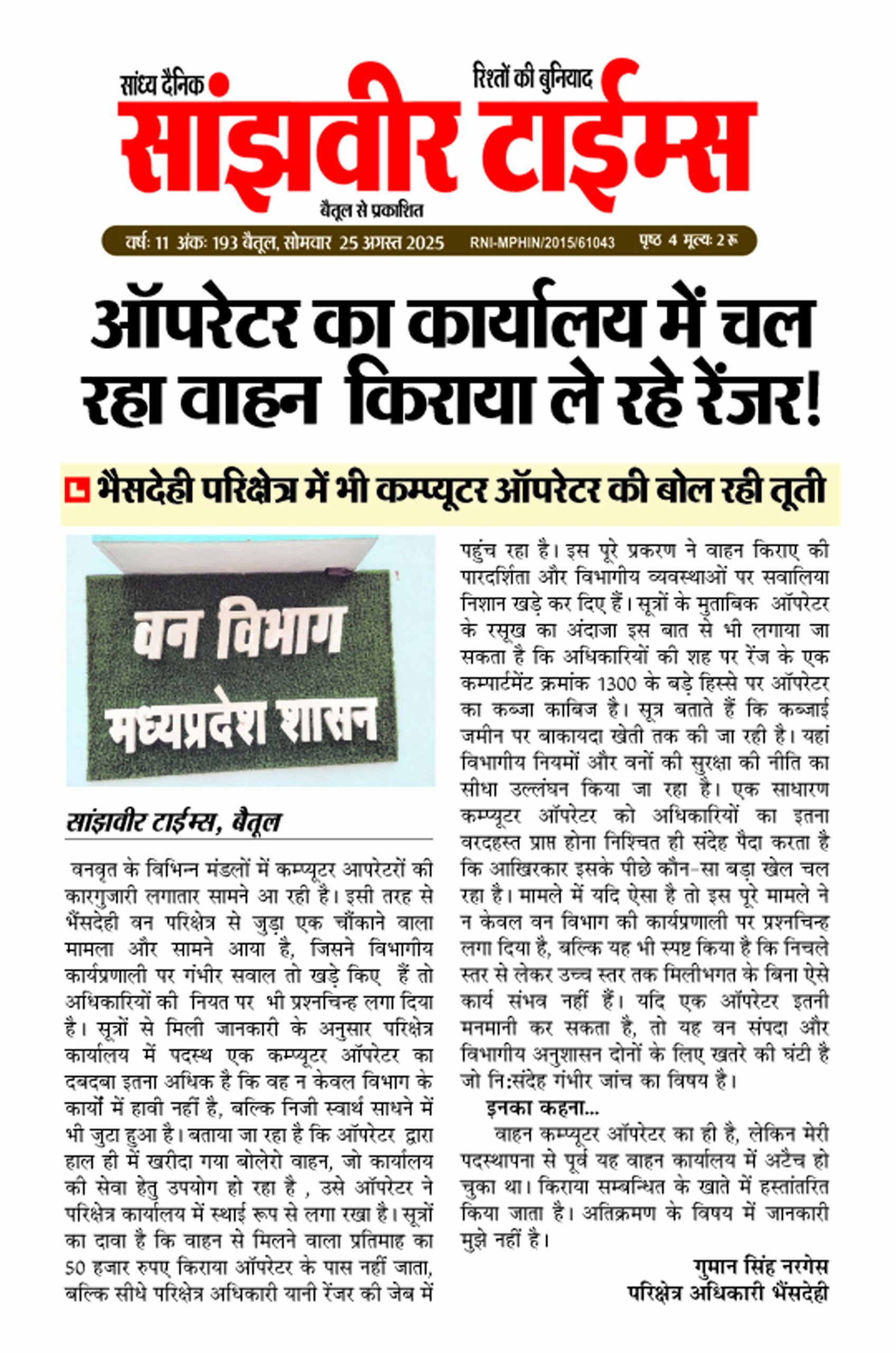 विभागीय सूत्रों का कहना है कि जिस तेजी से चैतू और उसके खास ऑपरेटरों के लिए लॉबिंग की जा रही हैं, उससे साफ है कि जो फर्जीवाड़ा पहले किया जाता रहा है। अंदरूनी सांठगांठ के चलते वह यथावत चलता रहे। ऐसी स्थिति में विभाग के ईमानदार और शिक्षित ऑपरेटर हतोत्साहित हैं। कई योग्य युवा जिन्होंने वर्षों तक विभाग में सेवा दी, उन्हें किनारे कर दिया गया है। जबकि नई नियुक्तियों में ऐसे लोग काबिज हैं जिन्हें फाइल पढ़ना या डिजिटल रजिस्टर में सही एंट्री करना तक नहीं आता। नतीजतन, विभागीय कामकाज प्रभावित हो रहा है और फर्जीवाड़े के नए रास्ते भी खुल रहे हैं। इस संबंध में सीसीएफ वासु कनौजिया को उनके मोबाइल 9424790300 पर काल किया, लेकिन कवरेज में नहीं होने के कारण उनसे चर्चा नहीं हो सकी।