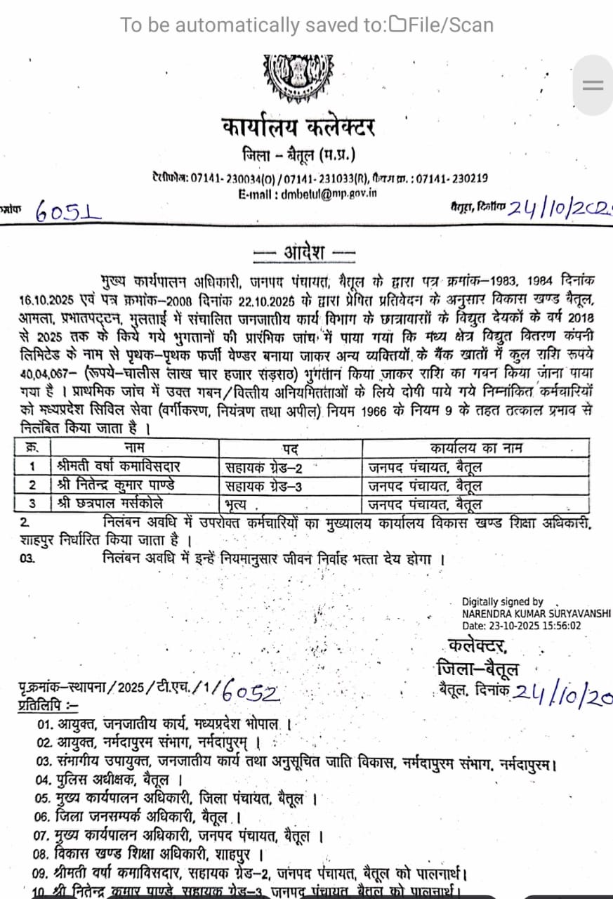 इस तरह कुल ₹40,04,067 का गबन किया गया। प्रारंभिक जांच रिपोर्ट के आधार पर मुख्य कार्यपालन अधिकारी, जनपद पंचायत बैतूल ने कार्रवाई करते हुए तीन कर्मचारियों को दोषी पाया और उन्हें तत्काल प्रभाव से निलंबित कर दिया है।