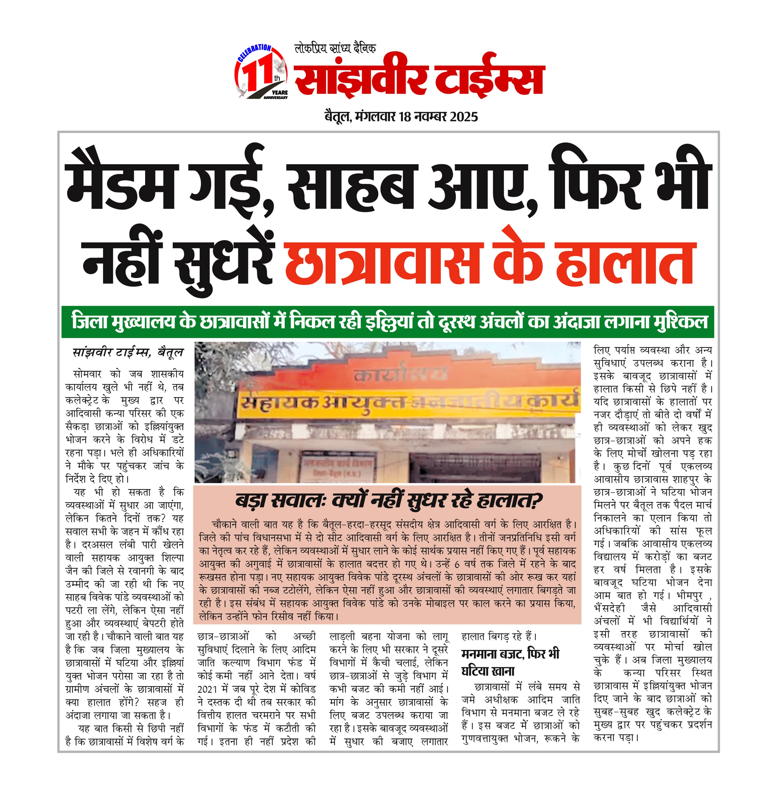Betul News: बैतूल। जिले में छात्रावासों की स्थिति को बिगाड़ने के लिए अधीक्षकों को जि मेदार कहा जा सकता है। इन्हीं के जि मे पूरे छात्रावास की व्यवस्था होती है, लेकिन लंबे समय से एक ही छात्रावास में जमे होने के कारण ध्यान नहीं दे पाने के कारण स्थिति लगातार बिगड़ रही है। चौकाने वाली बात यह है कि आदिवासी मामलों के केंद्रीय राज्य मंत्री और स्थानीय सांसद दुर्गादास उईके ने पिछले दिनों भैंसदेही के एक कार्यक्रम में अजाक के अधिकारियों को निर्देश दिए थे कि लंबे समय से जमे अधीक्षकों को तत्काल हटाया जाए, लेकिन दो माह बीतने के बाद उनके आदेश का पालन नहीं हुआ। इस बात से अंदाजा लगाया जा सकता है कि अधीक्षकों पर विभागीय अधिकारियों की कितनी मेहरबानी है।