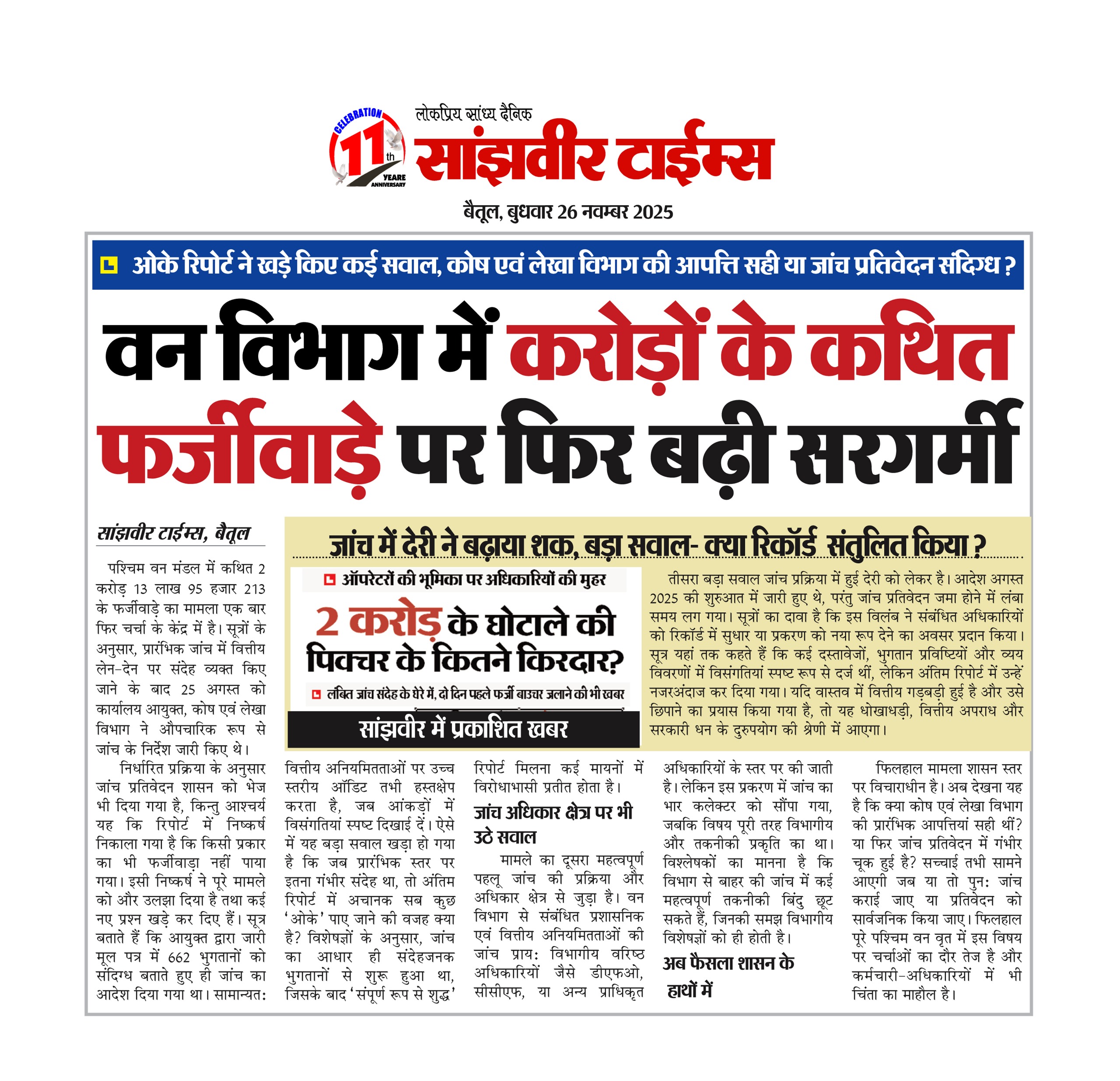 Betul Samachar: बैतूल। पश्चिम वन मंडल में फर्जी भुगतानों के माध्यम से 2 करोड़ 13 लाख 95 हजार रुपए के कथित घोटाले का मामला थमने का नाम नहीं ले रहा। कोष एवं लेखा आयुक्त द्वारा उठाई गई गंभीर आपत्तियों के बावजूद जांच प्रतिवेदन में सभी भुगतानों को ओके बताया जाना विभाग में चर्चाओं का विषय बना हुआ है। विभागीय सूत्रों का दावा है कि जांच अधिकारियों को प्रभावित कर पूरा प्रकरण पलट दिया गया, जिसमें कर्मचारियों के साथ कुछ उच्च अधिकारियों की मिलीभगत की चर्चा भी जोरों पर है।