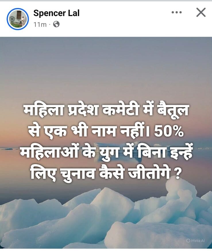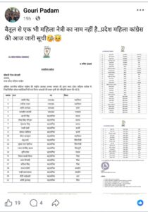 प्रदेश महिला कांग्रेस की इस सूची पर उन्होंने आश्चर्य व्यक्त किया है। दूसरी तरफ कांग्रेस के पूर्व जिला संगठन मंत्री स्पेंसर लाल ने अपनी ही पार्टी को आड़े हाथ लेते हुए सोशल मीडिया पर लिखा है कि महिला कांग्र्रेेस में बैतूल से एक भी नाम नहीं। 50 प्रतिशत महिलाओं के युग में बिना इन्हें लिए चुनाव कैसे जीतेंगे?