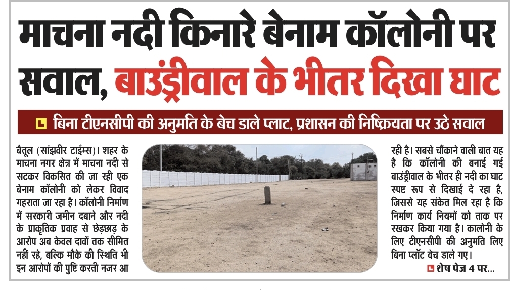 Betul Ki Khabar: बैतूल। शहर के लोहिया वार्ड स्थित माचना नदी किनारे तथाकथित अवैध कालोनी में नियम कायदे ताक पर रखकर प्लाट बेचने की सुगबुगाहट चल रही है। सांझवीर टाईम्स में इसे लेकर दो समाचार प्रकाशित करने के बाद राजस्व और नपा अमले में हडक़ंप मचा है। खबर है कि राजस्व विभाग की टीम ने मौका मुआयना कर जमीन की नाप जोख की है, जबकि नगर पालिका ने नोटिस जारी कर कालोनी संचालक को 3 तीन के भीतर जवाब मांगा था, लेकिन आज तक जवाब नहीं दिया है।